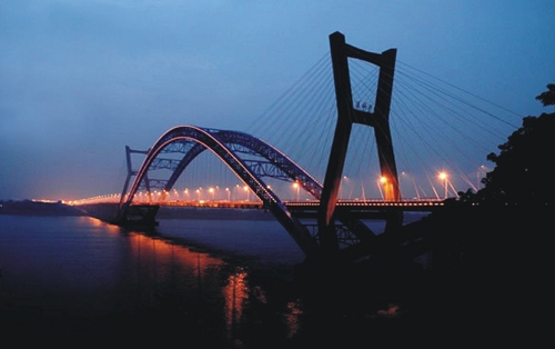 湖南湘潭蓮城大橋 主跨400米,雙飛燕斜拉鋼管砼拱橋,2007年7月建成通車,世界首座斜拉鋼管拱橋。單側吊裝節(jié)段27段,單節(jié)段最大吊重120噸,公司承擔主拱吊裝工程。