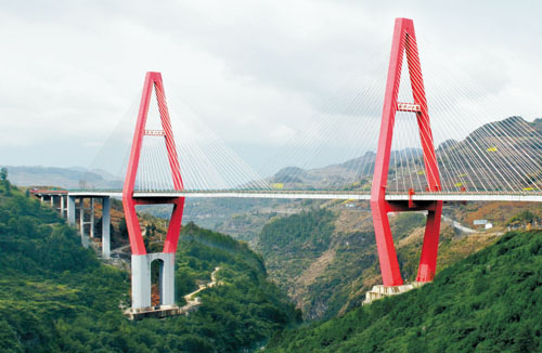 全長(zhǎng)840米,主跨360米,主塔高188.01雙塔雙索面PC砼斜拉橋,2009年12月建成通車。