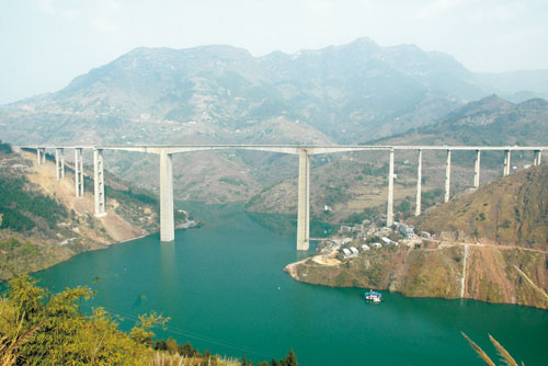重慶云(陽)萬(州)高速湯溪河特大橋全長(zhǎng)950.44米,主跨230米,主墩高156米,預(yù)應(yīng)力砼連續(xù)鋼構(gòu)橋,2008年12月建成通車。