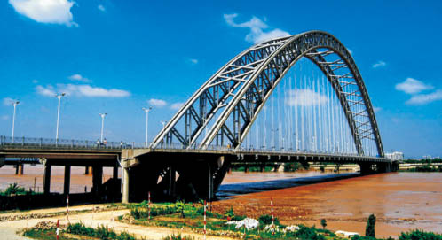 全長1402.15米,主跨338米,單跨下承式鋼管砼變高度桁式有推力無鉸拱橋,2004年10月建成通車。共46個吊裝節(jié)段,單節(jié)段最大吊重121.8噸,公司承擔吊裝工程。